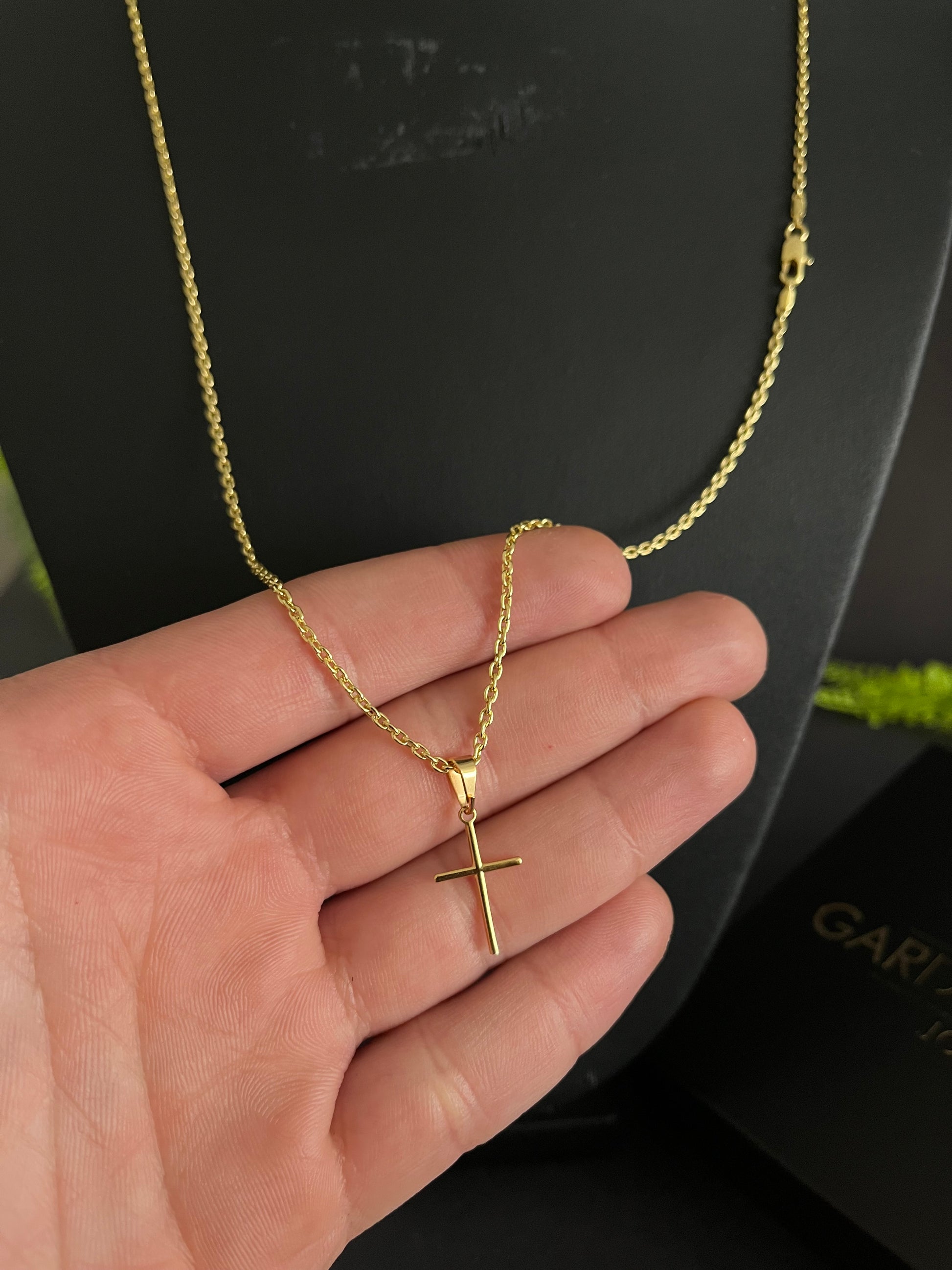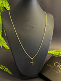Corrente Cadeado de quina 1mm + Cruz palito MINI - Banhado a ouro 18k