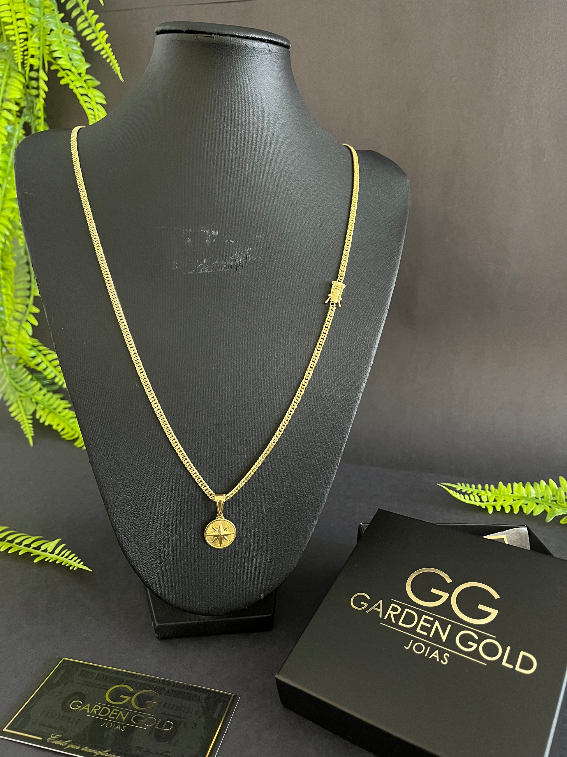 Corrente Grummet 3mm + Pingente Rosa dos ventos - Banhado a ouro 18k