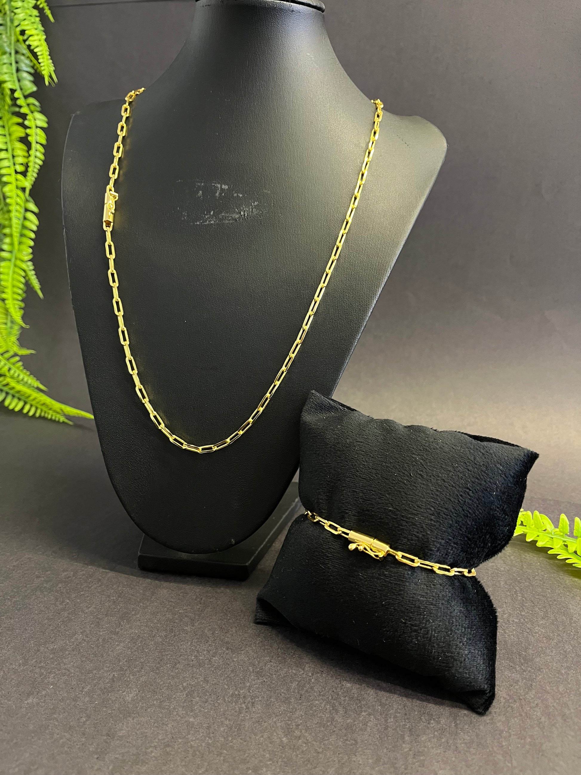 Corrente + Pulseira Cadeado alongado 4mm - Fecho bomba - Banhado a ouro 18k